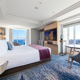 カップルやご夫婦で横浜に宿泊するなら「ヨコハマ グランド インターコンチネンタル ホテル」がおすすめです。みなとみらいの中でも海側に建つヨットの帆のような形が印象的です。客室は海をイメージしたブルーを使った落ち着いた雰囲気があります。